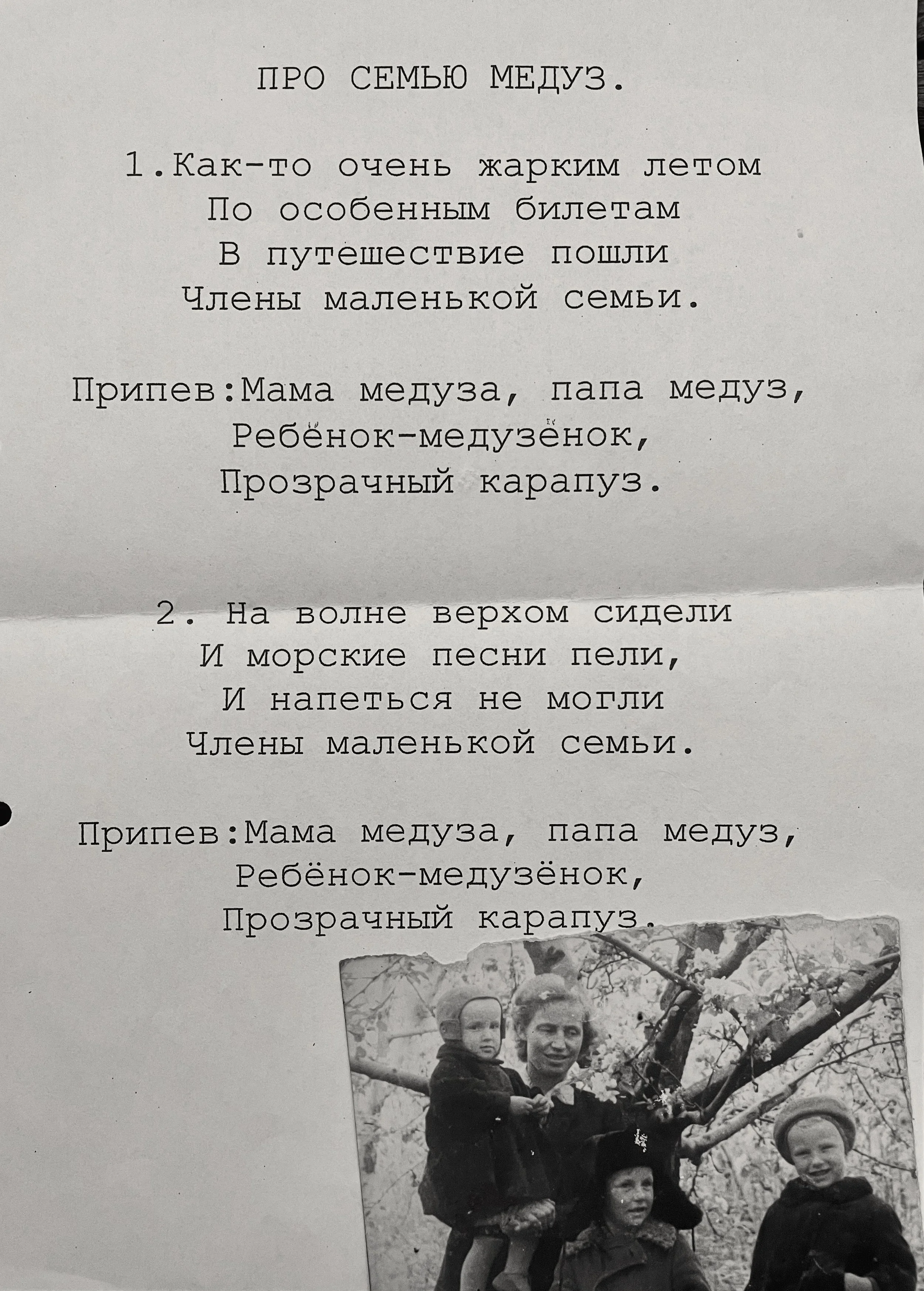 Chorus: Mama Jellyfish, Papa Jellyfish, And the child – a jellyfish child, A tiny, see-through little tot.